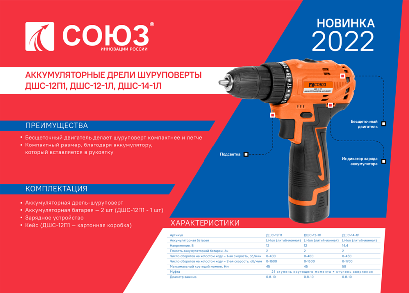 Аккумуляторный шуруповерт СОЮЗ ДШС-12П1