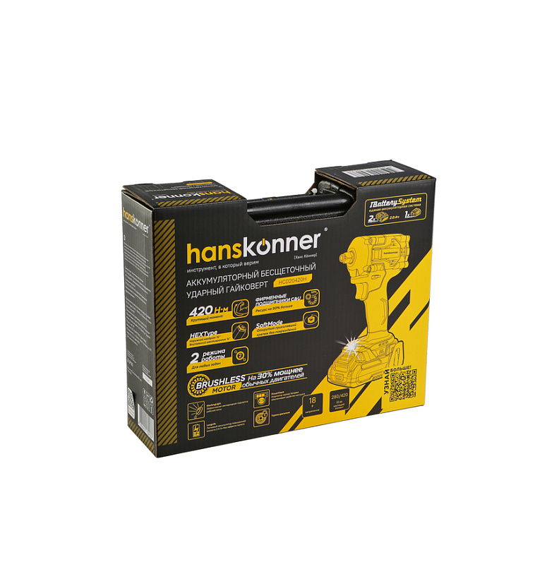 Hanskonner HCD20420H – аккумуляторный 18 В, ударный гайковерт с наружным квадратом 1/2″ и возможностью установки оснастки под шестигранник 1/4″ – является частью системы 1BatterySystem, обеспечивающей совместимость одного и того же аккумулятора с целым рядом наименований инструмента. Модель обладает максимально сбалансированной компоновкой: небольшие размеры корпуса и рукояти позволяют эффективное использование в условиях с затрудненным доступом, а нейтральный центр тяжести, и обилие прорезиненных противоскользящих поверхностей способствуют надежному хвату, и лучшему контролю. Гайковерт оснащен 18 В бесщеточным двигателем, характеризующимся на 30% лучшей производительностью в сравнении с коллекторными аналогами. Кроме того, бесщеточный двигатель отлично справляется с кратковременными перегрузками и не склонен к перегреву. Модель Hanskonner HCD20420H имеет два режима настройки крутящего момента: 280 Н м и 420 Н м – пользователь выбирает нужный, исходя из поставленных задач. Функция деликатного откручивания SoftMode обеспечивает максимально аккуратное откручивание прикипевшего крепежа, исключая его повреждение. К особенностям Hanskonner HCD20420H стоит отнести электронный тормоз двигателя, эффективную LED-подсветку рабочей зоны WorkingLight с блоком коллиматорных линз, создающих направленный симметричный луч, а также индикатор остаточного заряда аккумулятора PowerCheck. Дополнительному комфорту использования способствует специальная зацепная скоба крепления на пояс и страховочный ремешок на руку. Гайковерт штатно комплектуется двумя литий-ионными (Li-ion) аккумуляторами емкостью 2.0 А ч с возможностью подзарядки от него через USB выход сторонних гаджетов, импульсным зарядным устройством, USB LED-фонарем, запитываемым от АКБ.