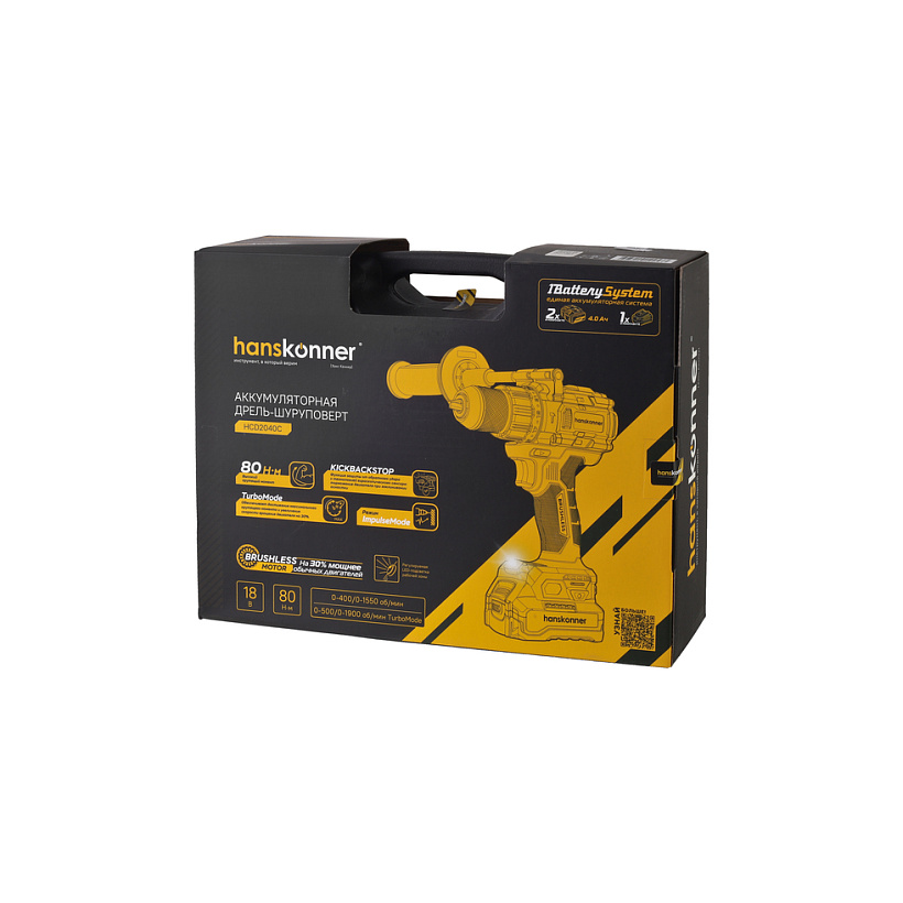 HCD2040C Дрель акк б/щ Hanskonner 18В, 1BatterySystem,80Нм,2х4Ач,ЗУ 4А,кейс