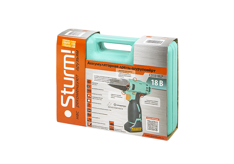 Sturm CD3318LP – аккумуляторный 18В двухскоростной шуруповерт бытового назначения. Представляет оптимальное сочетание мощности, компактности и широкого функционала. Минимальная толщина корпуса и рукояти, а также применение конусного патрона позволяют эффективно использовать шуруповерт в условиях с трудным доступом. Нейтральный центр тяжести и обилие прорезиненных противоскользящих поверхностей способствуют надежному хвату и лучшему контролю инструмента в процессе работы, а дополнительные резиновые накладки на боковинах корпуса амортизируют удар при случайном падении и удерживают инструмент на наклонной поверхности, предотвращая его соскальзывание. Модель оснащена производительным 18В электромотором и мощным планетарным механизмом, позволяющими эффективное использование инструмента при различных операциях: от работ с крепежом разного размера до сверления в различных материалах. Редуктор имеет две скорости – режим пониженных оборотов (0 – 400 об / мин) предназначен для работ с крепежом, режим повышенных оборотов (0 – 1500 об / мин) – для сверления отверстий. Благодаря муфте регулировки усилия c 21 фиксированным положением, значение момента затяжки на валу шпинделя можно изменять в широком диапазоне – это дает возможность максимально гибко настраивать инструмент применимо к видам используемых крепежных элементов и их размеру, а также учитывая материал заготовки. Важными особенностями Sturm CD3318LP являются функция блокировки вала шпинделя, за счет чего достигается быстрота замены оснастки, а также электронный тормоз выбега двигателя, обеспечивающий моментальную остановку патрона – удобство при серийной работе. Для комфорта пользователя при работе в условиях недостаточной освещенности предусмотрена LED подсветка рабочей зоны. Модель штатно комплектуется парой литий-ионных (Li-ion) аккумуляторов, емкостью 2 А ч, импульсным зарядным устройством, позволяющим быструю зарядку полностью разряженного аккумулятора (время полной зарядки 50 – 60 минут), а также пластиковым кейсом для удобства хранения и транспортировки.