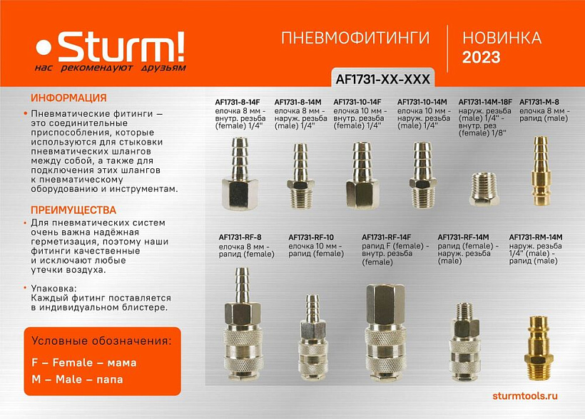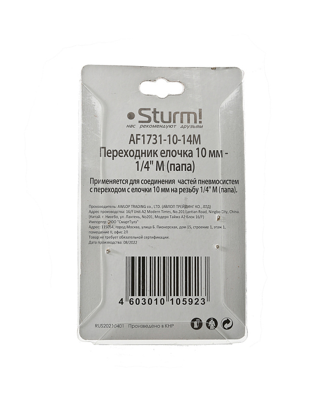 Пневмофитинг елочка 10 мм на наружнюю резьбу (папа) 1/4" Sturm!