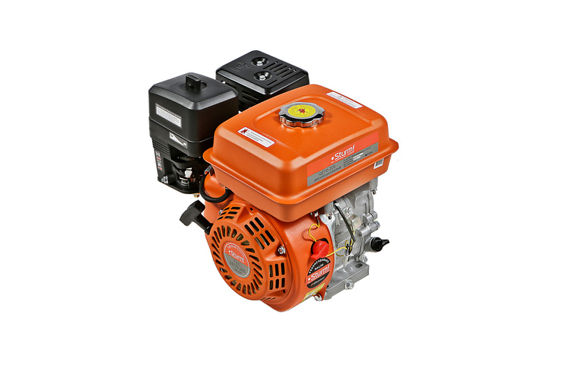 Sturm GE170-20S – четырехтактный одноцилиндровый бензиновый двигатель воздушного охлаждения. Предназначен для установки на мотоблоки, культиваторы, мотопомпы, снегоуборщики, скарификаторы и другую садовую технику. Рабочий объем – 208 см3. Мощность – 5.2 кВт. Характеризуется высокой надежностью, долговечностью и простотой в обслуживании. В конструкции силового агрегата применен ряд хорошо отработанных и проверенных технических решений: покрытая твердым хромом поршневая группа, кованый коленчатый вал, усиленный картер, электронная бесконтактная система зажигания, карбюратор, обеспечивающий стабильность работы при различных температурных условиях. Особенностью модели Sturm GE170-20S является система автоматической остановки и блокировки запуска при низком уровне масла, предотвращающая работу двигателя без наличия достаточного количества масла в картере. Эффективную фильтрацию воздуха на впуске обеспечивает сухой воздушный фильтр. Система запуска – с помощью ручного стартера.
