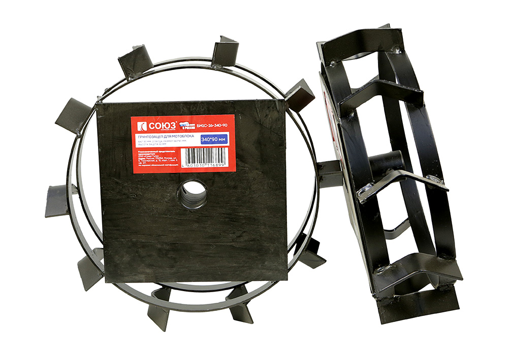 Грунтозацепы 340 мм S23 шестигранный вал Sturm! GKE-24-340 -Грунтозацепы используются в качестве замены резиновых колес и обеспечивают сцепление с грунтом при работе мотоблока. Колеса выполнены в виде нескольких полос металла со вваренными в середину листами металла. На такие колеса почва не налипает, выдавливаясь в пустоты между лентами. В результате сцепление с грунтом будет выше. Диаметр ступицы S24 (шестигранная) мм, диаметр грунтозацепа 340 мм, ширина 90, количество ободов 2.
