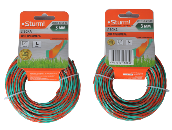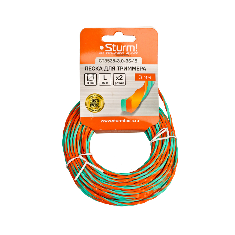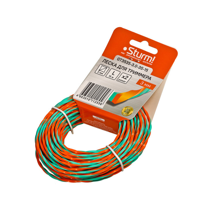 Леска для триммера, усилен., d=3.0 мм, l=15 м, круч.квадр, оранж./зел. Sturm!