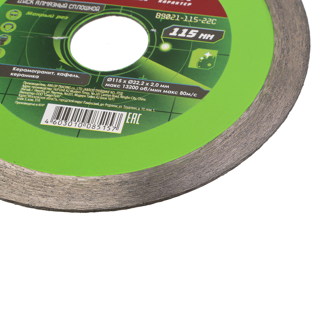 Диск алмазный сплошного типа для мокрой резки по кафелю, керамике и керамической плитке позволяет получить ровные края без сколов и трещин. Self-sharpening technology -Технология самозаточки позволяет диску сохранять высокую скорость реза даже при длительной работе. Тело диска из стали марки 65Mn и метод горячей опрессовки при производстве алмазных дисков увеличивает его износостойкость и срок эксплуатации. Правильно подобранные компоненты металлической связки обеспечивают постепенный равномерный износ алмазного слоя.