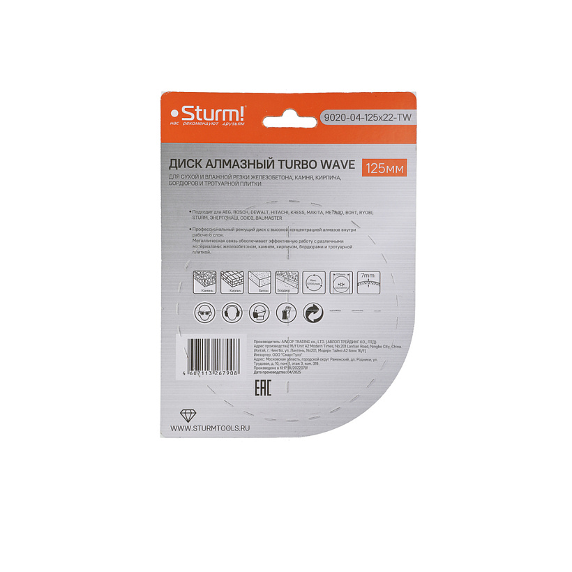Алмазный диск, сухая/влажная резка Turbo Wave 125мм Sturm!