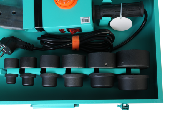 Нагревательная платформа инструмента позволяет работать с насадками разных диаметров (от 20 до 63 мм) и сконструирована таким образом, что допускает одновременную установку сразу шести (по три с каждой стороны платформы) насадок, за счет чего в процессе работы не приходится тратить дополнительное время на их замену. Насадки (входят в штатную комплектацию) имеют двойное покрытие из японского тефлона – обладают антипригарными свойствами, исключая прилипание разогретого пластика к поверхности, что гарантирует аккуратность и высокое качество монтажных работ. Также, в комплект модели входит целый комплекс вспомогательных аксессуаров, которые сделают сварочный процесс значительно проще и комфортнее: ножницы для труб, рулетка, отвертка, перчатки. Удобство хранения и транспортировки обеспечивает надежный металлический кейс.