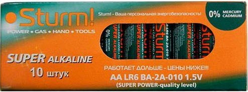 Батарейка алкалиновая Sturm BA-2А-010 (SUPER POWER) Предназначена для использования во всех типах устройств, работающих от батареек Особенности: Не содержит кадмия и ртути Размер АА Количество в упаковке: 10 шт