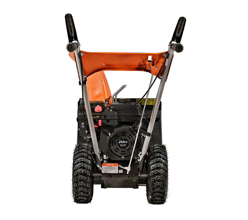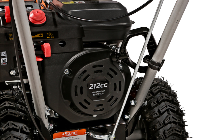 Sturm STG7453 — универсальный самоходный бензиновый снегоуборщик. Предназначен для расчистки территорий от снега различной плотности, как свежевыпавшего, так и слежавшегося. Модель оснащена надежным и неприхотливым четырехтактным двигателем KC, специально адаптированным для зимней эксплуатации, а также многоступенчатой трансмиссией, значительно повышающей универсальность машины. Конструкцией предусмотрены четыре скорости движения вперед и одна назад, выбор нужной скорости производится с помощью удобного рычага переключения. Низшая передача применяется при уборке плотно слежавшегося и мокрого снега, средние передачи — для работы со свежевыпавшим снегом, высшая передача — транспортный режим, предназначенный преимущественно для перемещения снегоуборщика. Высокая производительность машины обеспечивается не только мощным двигателем, но и продуманной конструкцией забора снега — этому способствует использование мощных агрессивных шнеков с большим профилем зуба, позволяющих легко справляться даже со слежавшимся снегом и настом, а также вместительного снегозагребного ковша, гарантирующего внушительную ширину прохода и возможность убирать сугробы до полуметра высотой. Снегоуборщик оснащен выпускным желобом с регулировкой как по направлению, так и углу выброса, благодаря чему пользователь без труда может настроить оптимальное расстояние, на которое будет отбрасываться снежная масса. Максимальная дальность выброса достигает 11 метров. Для лучшего сцепления с поверхностью модель комплектуется специальными шинами с глубоким протектором.