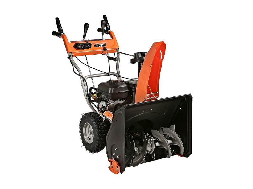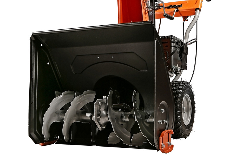 Sturm STG7461EL — универсальный самоходный бензиновый снегоуборщик. Предназначен для расчистки территорий средней и большой площади от снега различной плотности, как свежевыпавшего, так и слежавшегося. Модель оснащена надежным и неприхотливым четырехтактным двигателем KC (рабочий объем 196 см3, мощность 7 л.с.), специально адаптированным для зимней эксплуатации, а также многоступенчатой трансмиссией, значительно повышающей универсальность машины. Конструкцией предусмотрены четыре скорости движения вперед и одна назад. Низшая передача применяется при уборке плотно слежавшегося и мокрого снега, средние передачи — для работы со свежевыпавшим снегом, высшая передача — транспортный режим, предназначенный преимущественно для перемещения снегоуборщика. Важная особенность модели Sturm STG7461EL — наличие системы электрозапуска: благодаря встроенному электростартеру запуск снегоуборщика максимально удобен и прост. При необходимости, пользователь может также осуществлять запуск и с помощью ручного стартера. Высокая производительность машины обеспечивается не только мощным двигателем, но и продуманной конструкцией забора снега — этому способствует использование мощных агрессивных шнеков с большим профилем зуба, позволяющих легко справляться даже со слежавшимся снегом и настом, а также вместительного снегозагребного ковша, гарантирующего внушительную ширину прохода и возможность убирать сугробы до полуметра высотой. Снегоуборщик оснащен надежным металлическим выпускным желобом, с регулировкой по направлению выброса. Поворот желоба осуществляется дистанционно, посредством специального рычага на панели. Кроме того, предусмотрена возможность настройки угла выброса, благодаря которой регулируется необходимое расстояние выброса снежной массы. Максимальная дальность достигает 11 метров. Удобство эксплуатации в сумерках и темное время суток обеспечивает мощная LED-фара — в условиях короткого зимнего дня ее наличие является важной составляющей эффективной работы. Для лучшего сцепления с поверхностью модель комплектуется широкими пневматическими шинами с глубоким протектором.