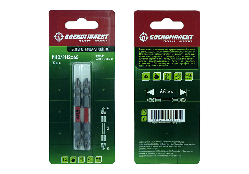 Биты двустор., торсион., PH2x65мм, сталь S2, 2шт, БОЕКОМПЛЕКТ
