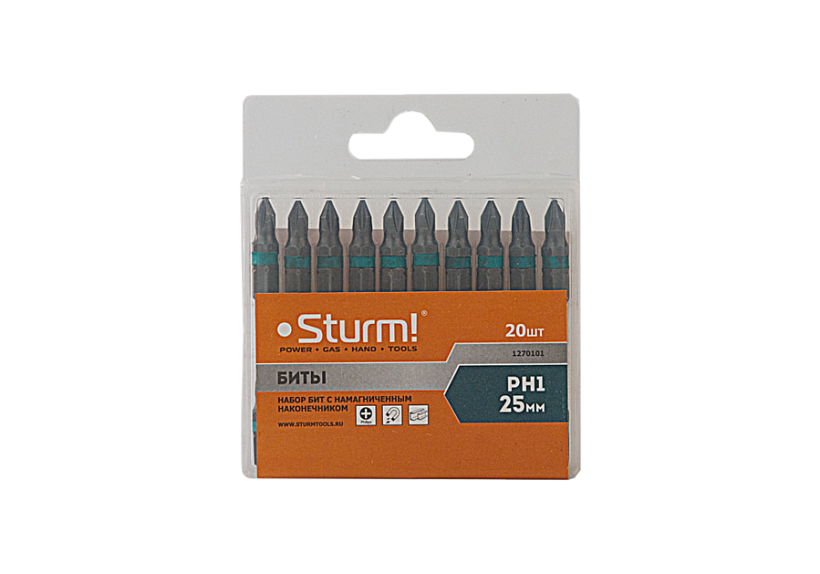 Биты PH1х25мм, сталь S2, С МАГНИТН. НАКОНЕЧНИКОМ,20 шт. В пластик.кейсе Sturm!
