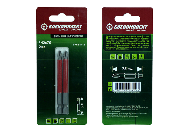 Биты PH2x75мм, сталь S2, 2шт, БОЕКОМПЛЕКТ