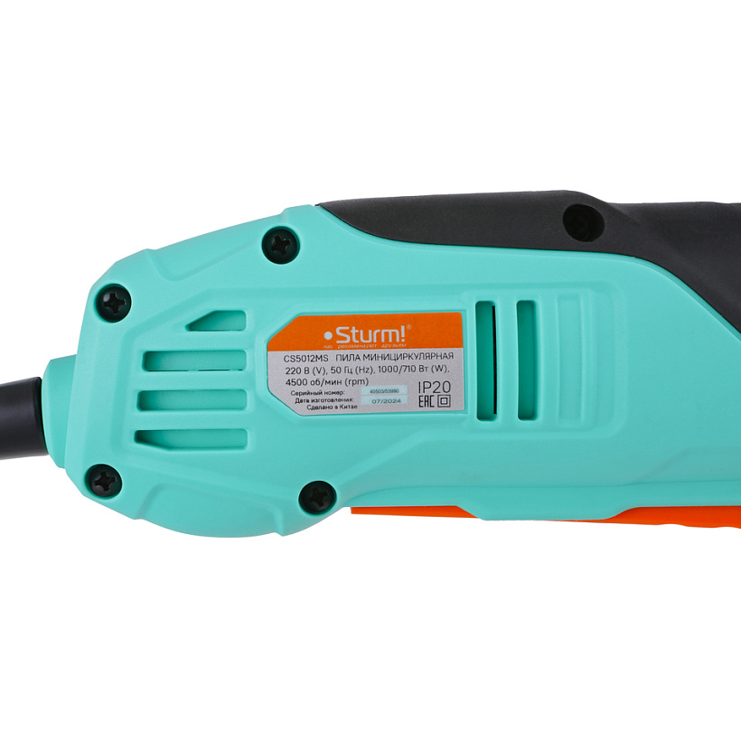 Sturm CS5012MS – универсальная циркулярная мини-пила. Предназначена для работы с наиболее распространенными пильными дисками рабочим диаметром 125 мм и посадочным диаметром 22.2 мм, и рассчитана под одноручный хват. Модель отличают компактность и небольшая масса, что дает возможность эффективно использовать инструмент в условиях ограниченного пространства или на весу. Наличие прорезиненных накладок на корпусе способствует лучшему контролю и надежности хвата. Модель оснащена 1000 Вт электродвигателем, развивающим скорость вращения оснастки 4500 об/мин и уверенно справляется с пропилами глубиной до 48 мм. Устойчивая к деформациям стальная опорная платформа с возможностью установки угла пропила от 90 до 45 градусов обеспечивает высокое качество углового реза. Максимально точно установить опорную платформу под требуемым углом позволяет специальная шкала с насечкой. Для большего удобства пользователя, модель Sturm CS5012MS имеет функцию блокировки вала шпинделя – с ее помощью замена пильного диска происходит быстро и легко, без необходимости применения вспомогательного, стопорящего вал ключа. Безопасность при работе гарантируют автоматически сдвигающийся в процессе работы защитный кожух, прикрывающий вращающийся пильный диск, а также блокиратор кнопки пуска, предотвращающий случайный запуск пилы. Вывод опилок из зоны резания обеспечивается благодаря специальному патрубку, позволяющему подключение пилы к строительному пылесосу. Наличие длинного четырехметрового сетевого кабеля расширяет рабочую зону до 50 м2, без необходимости применения дополнительного удлинителя.