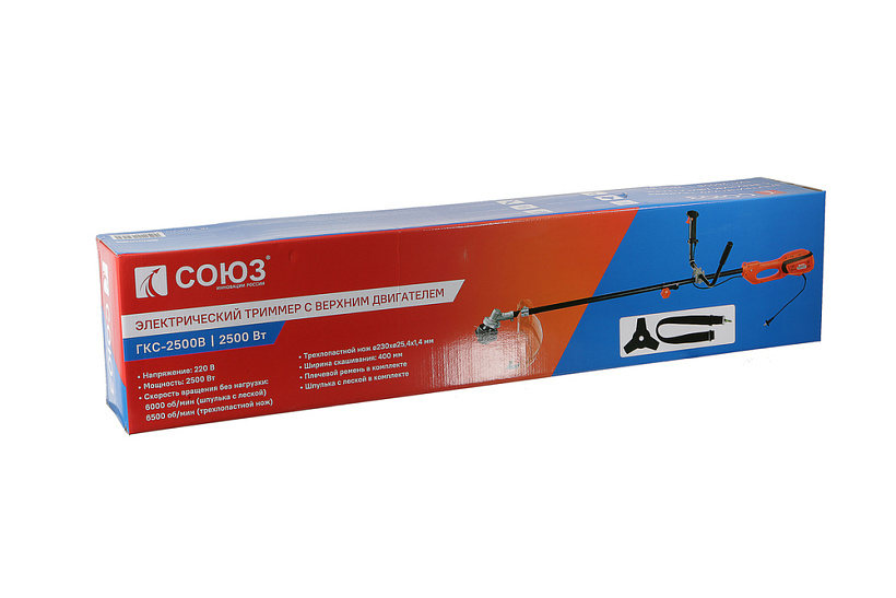 В штатную комплектацию модели СОЮЗ ГКС-2500В входят катушка с леской, трехлопастной режущий нож, наплечный ремень и набор аксессуаров для сборки.