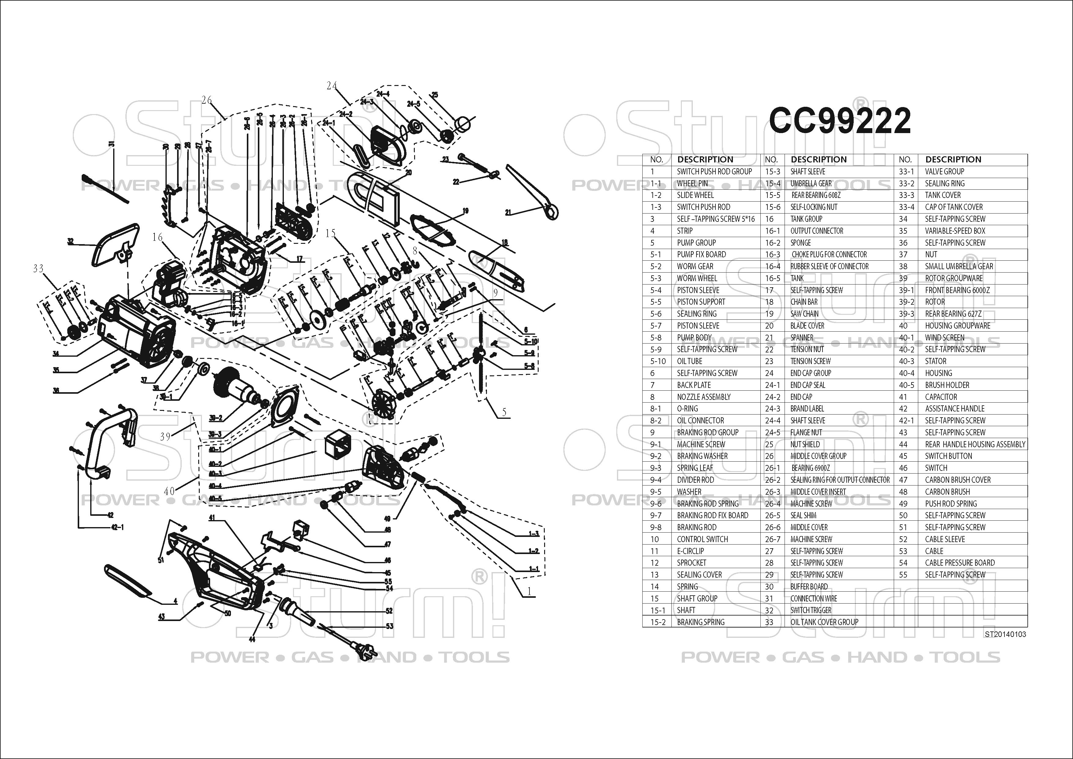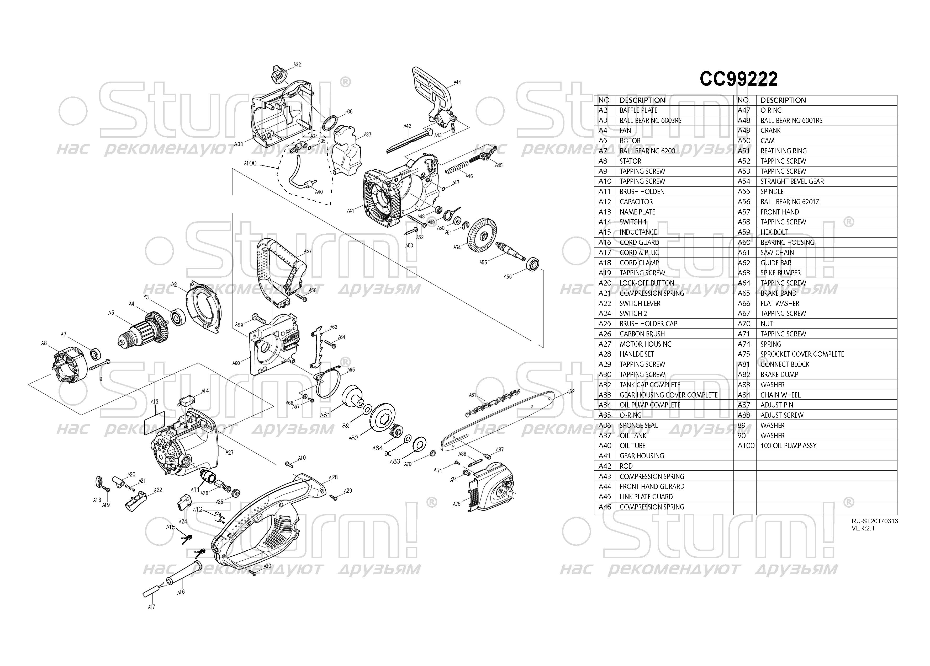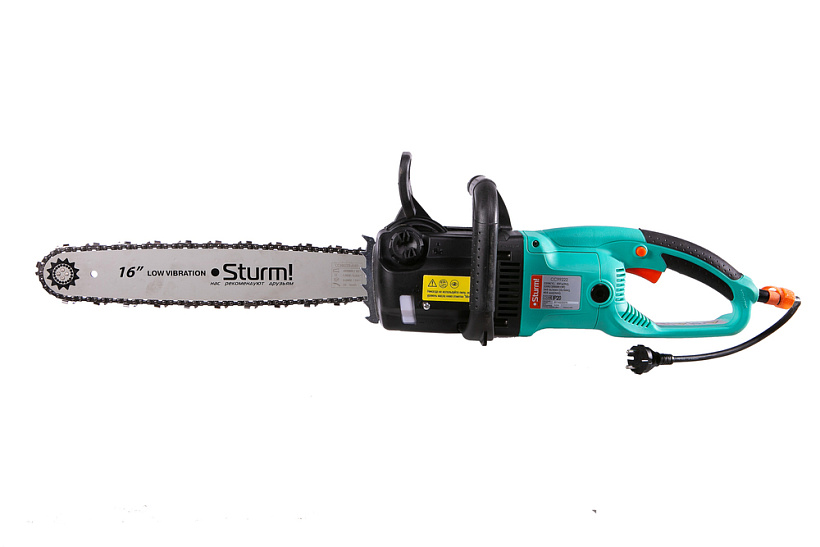 Sturm CC99222 — производительная электрическая цепная пила бытового назначения. Благодаря компоновке с продольным расположением электромотора и, как следствие, небольшой ширине корпуса, нейтральному центру тяжести и хорошей эргономике, инструмент обладает отличной маневренностью, облегчая выполнение пропилов под различными углами, а также позволяя эффективное использование в условиях ограниченного пространства. Модель оснащена электромотором мощностью 2.2 кВт и развивает скорость движения цепи в 360 м/мин — это способствует как высокой скорости единичного пропила, так и общей производительности при значительных объемах работы. Для обеспечения высокого ресурса инструмента особое внимание уделено наиболее нагруженным элементам конструкции: электромотор покрыт несколькими изоляционными слоями термостойкого лака и имеет дополнительное бронирование армирующей нитью, вал приводной звездочки установлен на шарикоподшипниках, шестерни редуктора выполнены из качественной легированной стали. Кроме того, применение шестерен с конической формой зуба позволило снизить уровень шума при работе. Инструмент оборудован автоматической системой подачи масла к пильной гарнитуре — при холостом режиме работы смазка приостанавливается. Есть возможность ручной регулировки количества подаваемого масла. Электропила проста в обслуживании и эксплуатации. Для удобства пользователя на модели Sturm CC99222 установлен автоматический механизм регулировки цепи, обеспечивающий ее оптимальное натяжение в процессе работы. За счет предусмотренной функции быстрого доступа к щеткам, их замена осуществляется без разбора элементов корпуса. Безопасность использования гарантируют механический тормоз экстренной блокировки цепи и защита от непреднамеренного пуска. Длинный трехметровый сетевой кабель позволяет расширить рабочую зону, не используя дополнительный сетевой удлинитель.