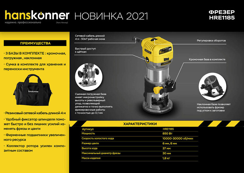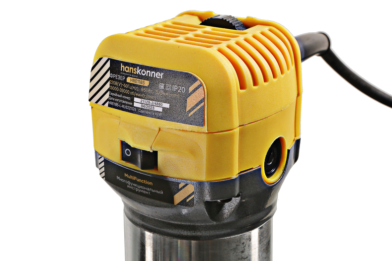 Hanskonner HRE1185 — многофункциональный компактный фрезер. Предназначен для решения широкого спектра задач: фрезерования различных типов пазов и канавок, снятия фасок, подгонки краев заготовок и изготовления декоративных элементов. Модель оснащена производительным 850 Вт электромотором, который обеспечивает стабильную работу даже при интенсивных нагрузках, позволяя уверенно справляться с обработкой древесины как мягких, так и твердых пород. Благодаря функции регулировки скорости вращения шпинделя в широком диапазоне от 10000 до 30000 об/мин, пользователь может с легкостью адаптировать инструмент под разные задачи, обеспечивая точные и аккуратные резы при выборке пазов, снятии фасок, обработке кромок и создании декоративных элементов. Важной особенностью модели Hanskonner HRE1185 является наличие в комплекте сразу трех сменных баз: кромочной, погружной и наклонной. Кромочная база предназначена для точной обработки краев заготовок, Погружная база позволяет выполнять вертикальное фрезерование, выборку материала на заданную глубину и сложные резы с высокой точностью. Наклонная база дает возможность работать под углом, что особенно полезно при изготовлении сложных соединений и декоративных элементов. Все базы легко заменяются. Инструмент обладает повышенными надежностью и ресурсом: коллектор ротора усилен композитным составом, подшипники имеют пылезащиту, корпус изготовлен с использованием нейлона, что способствует лучшей прочности и долговечности. Для удобства пользователя предусмотрен фиксатор вала шпинделя, упрощающий процесс смены оснастки. Функция быстрого доступа к щеткам позволяет с максимальным удобством производить их замену, не прибегая к демонтажу элементов корпуса. Наличие длинного четырехметрового сетевого кабеля 4VelcroRubber с резиновой изоляцией позволяет обеспечить рабочую зону площадью до 50 м2 без необходимости применения дополнительного сетевого удлинителя. В штатную комплектацию модели Hanskonner HRE1185 входит прочная матерчатая сумка, для комфорта транспортировки инструмента и аксессуаров.