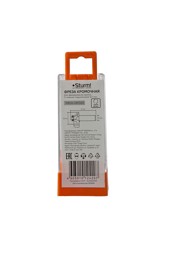 Фреза кромочная калевочная с подшипником 12,7 мм, dxhxl 22x13x57 мм, хв.8 Sturm!