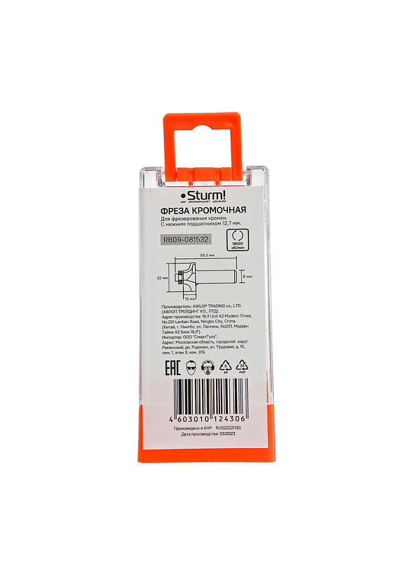 Фреза кромочная калевочная с подшипником 12,7 мм, dxhxl 32x15x59,5 мм, хв.8 Sturm!