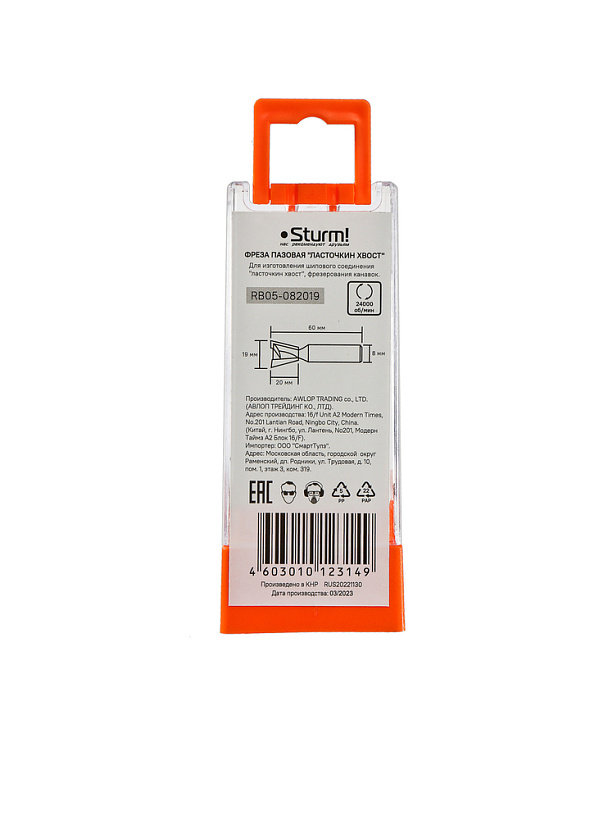 Фреза пазовая "ласточкин хвост" dxhxl 19x20x60 мм, хв.8 Sturm!
