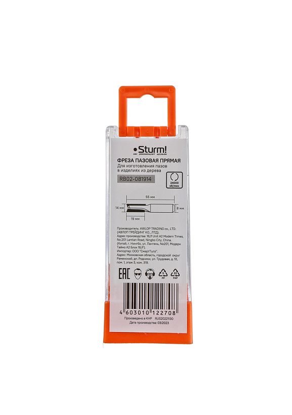 Фреза пазовая прямая с двойным лезвием dxhxl 14x19x55 мм, хв.8 Sturm!