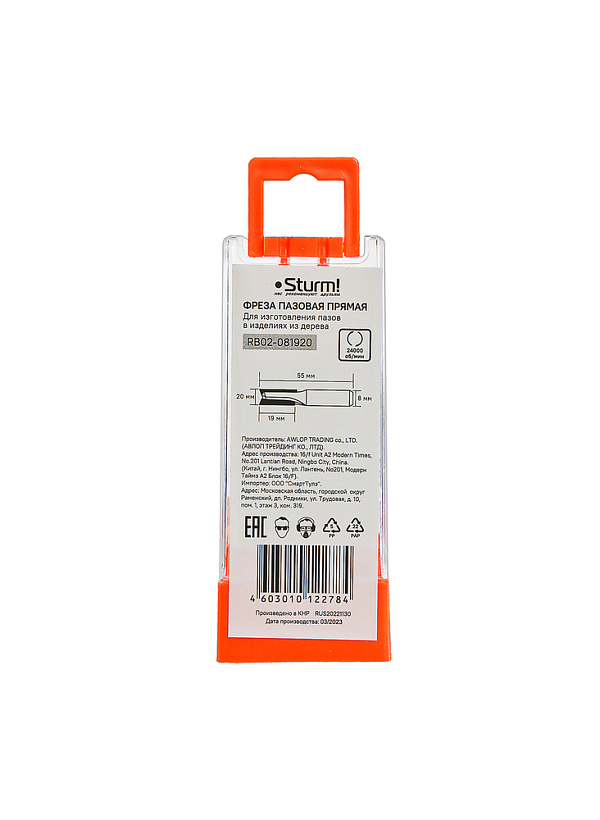Фреза пазовая прямая с двойным лезвием dxhxl 20x19x55 мм, хв.8 Sturm!
