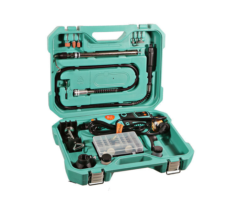 Хорошая эргономика корпуса с противоскользящими накладками дополняется наличием вспомогательной рукоятки для хвата при выполнении деликатных работ и стойки для подвешивания гравера с помощью складной скобы при работе с использованием гибкого вала.