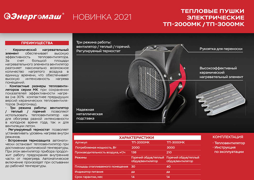 Керамический обогреватель Энергомаш ТП-2000МК. Керамический нагревательный элемент обеспечивает высокую эффективность тепловентилятора. За счет большой площади нагревательного элемента вентилятор разгоняет максимально возможное количество нагретого воздуха в единицу времени, что обеспечивает высокую интенсивность нагрева помещений. Компактные размеры тепловентиляторов серии МК при сохранении показателей эффективности нагрева. Три режима работы: вентилятор / теплый / горячий позволяют использовать тепловентилятор как для обогрева разной интенсивности в холодное время года, так и для вентиляции летом. Регулируемый термостат позволяет устанавливать уровень нагрева внутри режимов. Встроенная термозащита автоматически остановит тепловентилятор при достижении критической температуры. При этом вентилятор прибора продолжит работу предохраняя внутренние части от перегрева. Автоматическое включение произойдет при остывании до рабочей температуры.