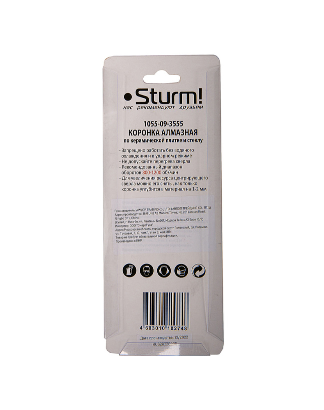 Коронка алмазн. По керам. Плитке и стеклу 35 х 55 мм с центрир. Сверл. Sturm!