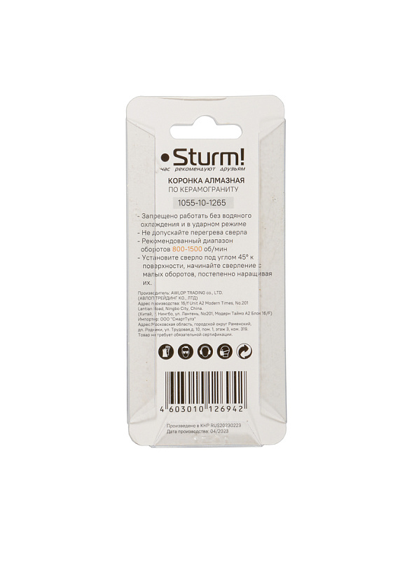 Коронка алмазная по керамограниту 12 х 65 мм, блистер, Sturm!