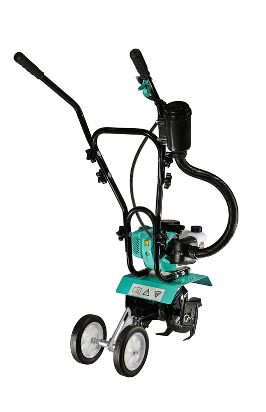 Транспортировочная колесная база при работе опрокидываются вверх, позволяя пользователю правильно выставить глубину обработки при помощи сошника.