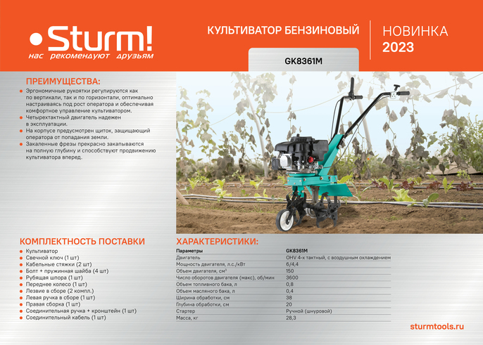 БензокультиваторSturm! GK8361M — практичная, компактная, мощная модель, оптимально подходит для рыхления почвы, удаления сорняков, перемешивания удобрений и прополки междурядий теплиц, парников, а также работы на склонах и участках небольшого размера или клумбах. Узкая ширина захвата позволяет использовать культиватор даже на очень тесных проходах.