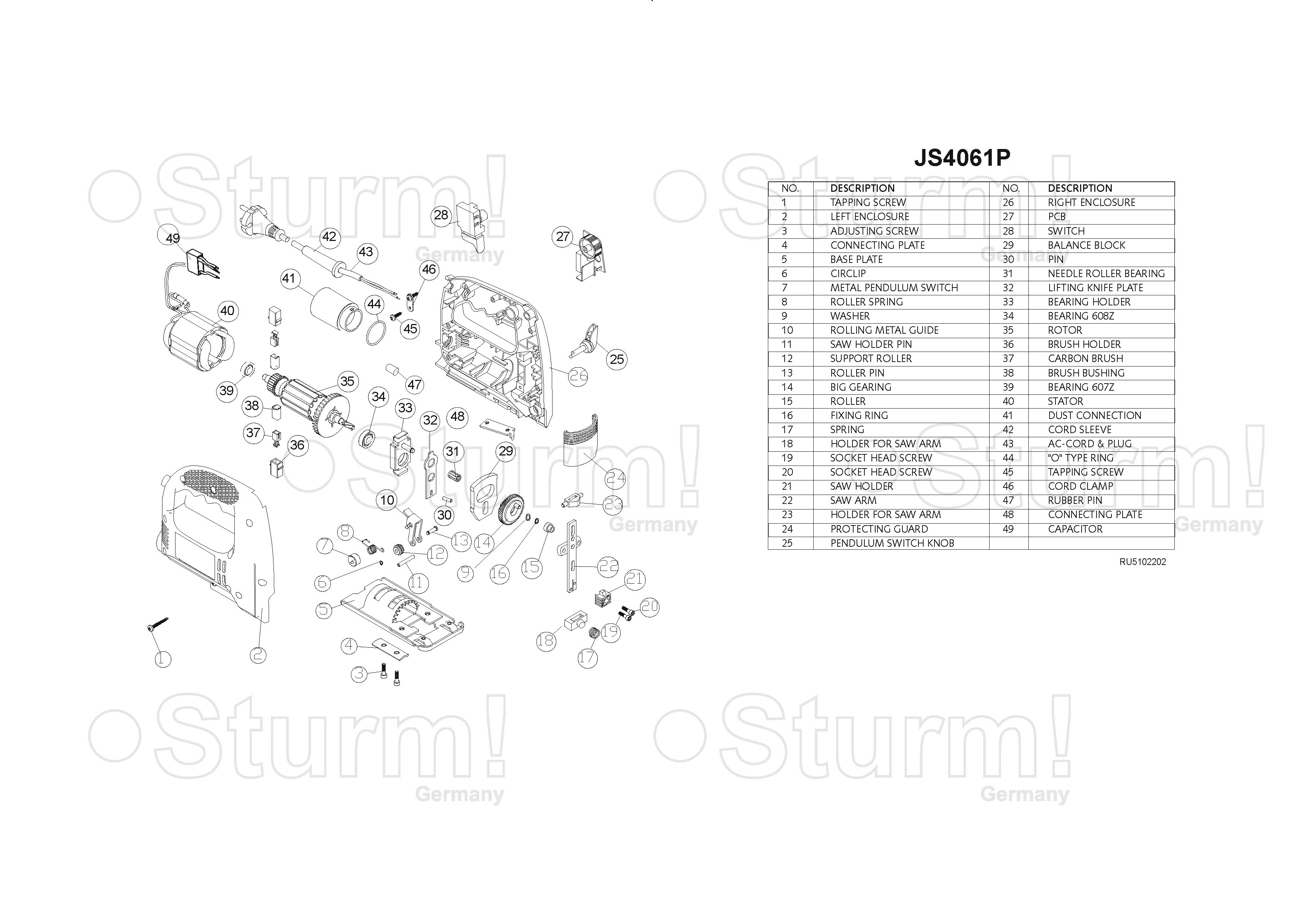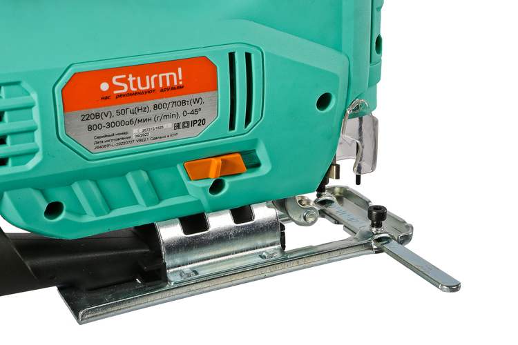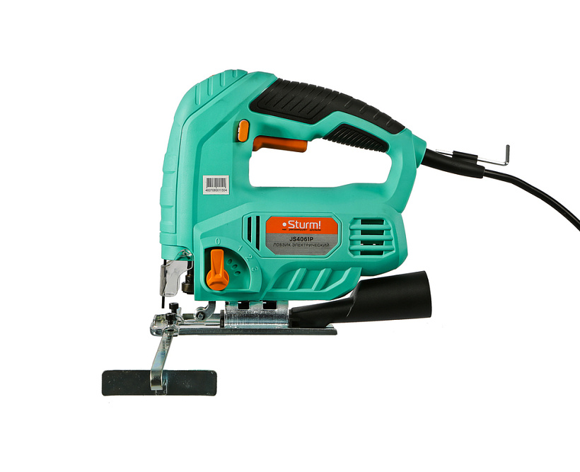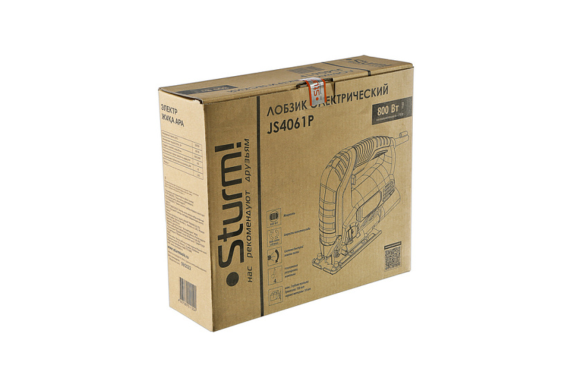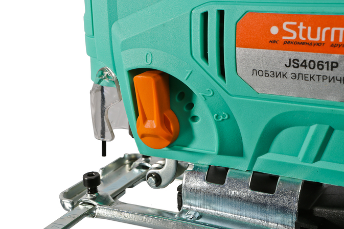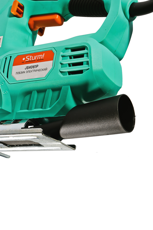 Sturm JS4061P – компактный и практичный электрический лобзик. Инструмент характеризуется небольшими массово-габаритными показателями и выверенной эргономикой – надежен в хвате и отлично контролируется даже одной рукой. Модель оснащена 800 Вт электромотором и мощной механической частью, благодаря чему демонстрирует достаточно высокие показатели по максимальной глубине пропила: до 100 мм в древесине и до 10 мм в металле. Наиболее точно настроить инструмент применимо к конкретному материалу позволяет электронная регулировка количества ходов штока (800 ¬– 3000 ход / мин), а также функция маятникового хода с четырьмя режимами – с помощью специального переключателя пользователь выбирает оптимальный режим работы с упором на максимальную производительность, либо максимальное качество реза с наименьшим количеством сколов. Для удобства пользователя на инструменте установлен механизм безыинструментальной замены полотна, за счет чего смена оснастки производится максимально быстро и просто, без необходимости применения специального ключа. Дополнительный комфорт при работе обеспечивают фиксация пусковой клавиши, прозрачный защитный щиток, а также возможность принудительного выдува опилок с рабочей зоны для лучшего обзора линии реза. При необходимости, возможно подключение к инструменту строительного пылесоса.