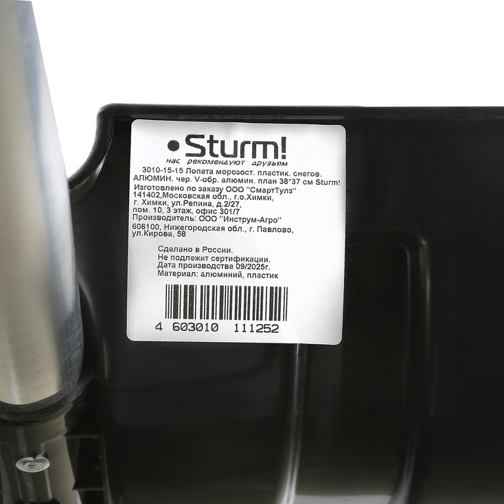 Лопата снегоуборочная 38х37 см, морозостойкий пластик, алюминевый черенок Sturm!