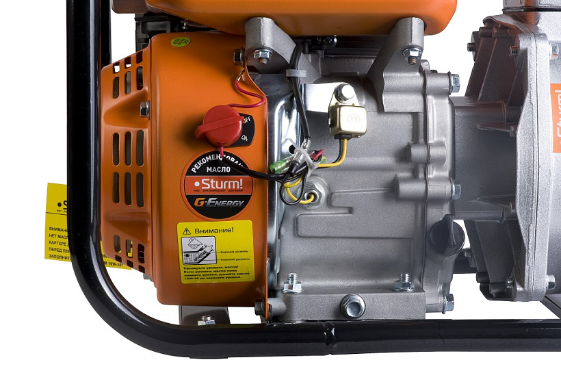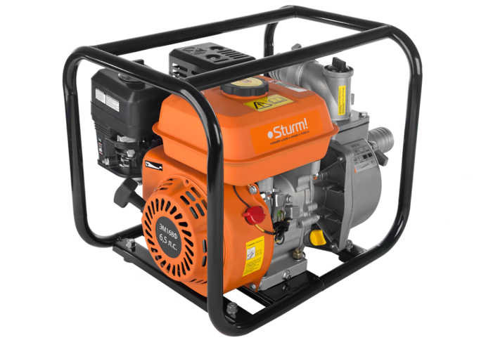 Sturm BP8761 — мощная универсальная бензиновая мотопомпа для домашнего, жилищно-коммунального или строительного применения. Отлично подойдет для использования в системах водоснабжения, орошения, полива, как в роли вспомогательного, так и основного оборудования. Имеет классическую компоновку: двигатель и насос смонтированы внутри прочной усиленной трубчатой рамы, страхующей основные узлы от случайных повреждений при транспортировке. Мотопомпа оснащается четырехтактным бензиновым двигателем рабочим объемом 212 см3 с верхним расположением клапанов (OHV) и воздушным охлаждением. Благодаря ряду технических решений — коленчатому валу повышенной прочности и усиленной цилиндро-поршневой группе, силовой агрегат надежен и неприхотлив в использовании. Кроме того, имеет одни из самых низких показателей по вибрации и уровню шума. На модели Sturm BP8761 установлен самовсасывающий насос центробежного типа, обеспечивающий максимальную производительность 600 л/мин, достаточную даже для организации полива больших площадей. Агрегат способен осуществлять забор жидкости с глубины до 8 метров, что позволяет выкачивать воду из достаточно глубокого колодца или скважины, и демонстрирует высоту подъема (напор) жидкости — 32 метра. Модель проста в обслуживании и эксплуатации и не требует от пользователя каких-либо специальных навыков. Тип запуска — с помощью ручного стартера.