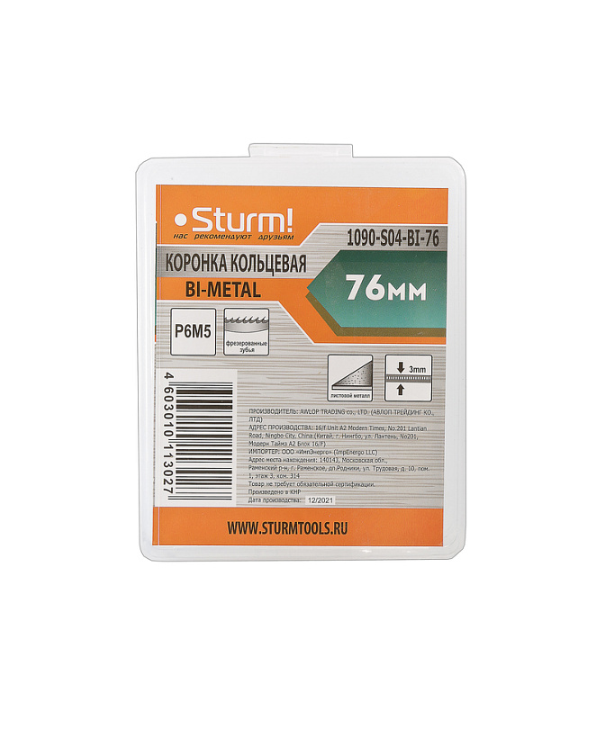 Коронка биметаллическая, 76 мм, по тонколистовому металлу, центрирующее сверло, Sturm!