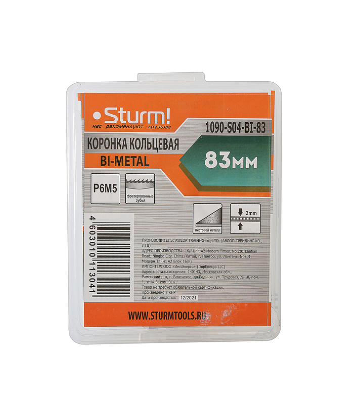 Коронка биметаллическая, 83 мм, по тонколистовому металлу, центрирующее сверло, Sturm!