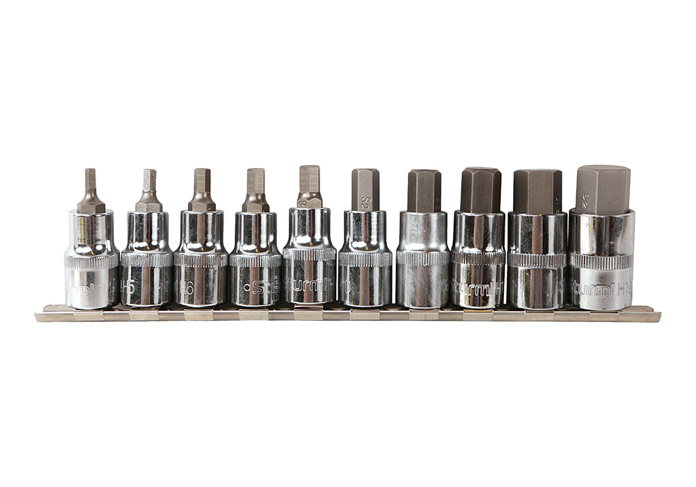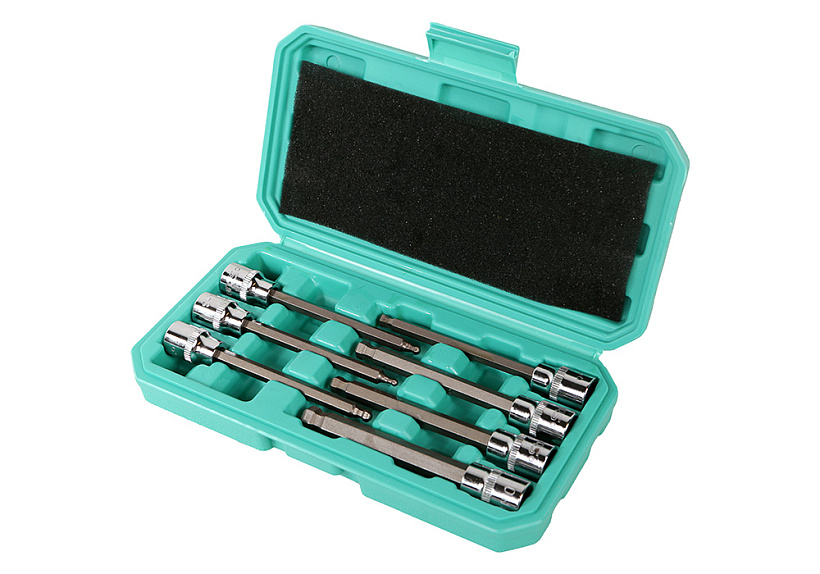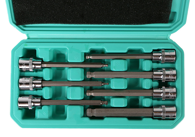 Набор голвок используется автомобилистами, слесарями, мастерами для обслуживания транспортных средств или в быту при работе с шестигранным крепежом. В комплект входит 7 головок с посадкой 3/8". Форма наконечника шар.