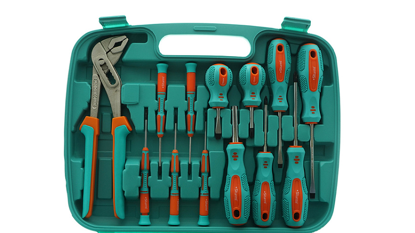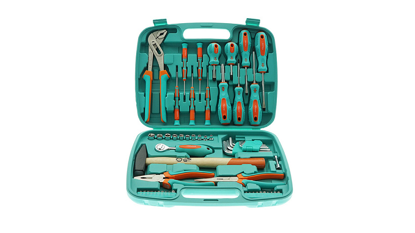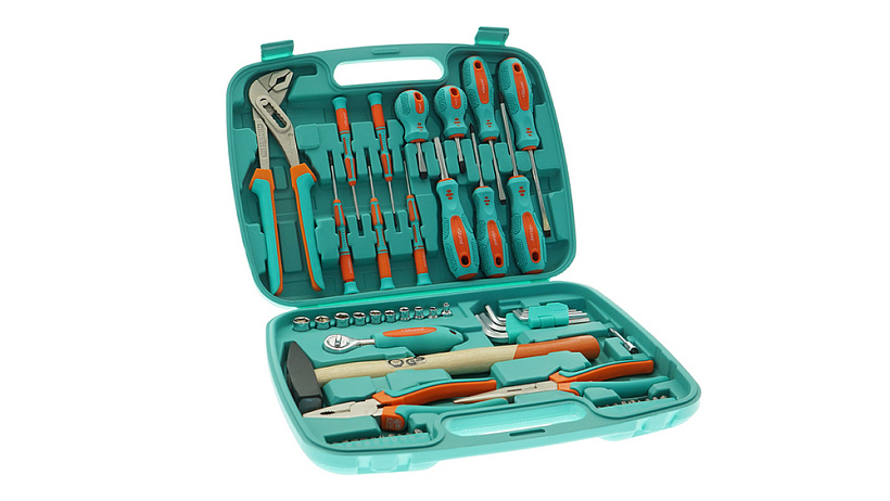 Набор инструмента из 57 предметов для мелкого бытового ремонта и обслуживания транспортных средств. Удобный и прочный пластиковый кейс обеспечивает надежное хранение инструмента.