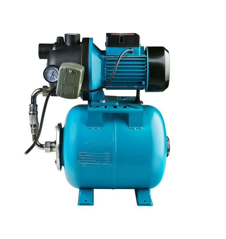 Sturm WP9780PL – автоматическая насосная станция – предназначена для создания давления в водопроводной сети загородных домов, дач и автоматического поддержания давления в заданном диапазоне, независимо от источника воды (водопровод, колодец, скважина и т д). Низкий уровень шума при работе позволяет устанавливать насосную станцию как вблизи, так и непосредственно в жилой зоне. Надежный асинхронный 800 ваттный двигатель в паре с мощным насосом, обеспечивают высокую производительность в 55 л/ мин и максимальный напор 40  метров. Забор воды осуществляется с глубины до 8 метров. Модель оснащена емким 20 литровым гидроаккумулятором с внутренней мембраной из натуральной резины, а также механическим реле давления для поддержания заданного уровня давления в водопроводе. Долговечности работы насосной части способствует крыльчатка, изготовленная из антифрикционного полимера PPO.