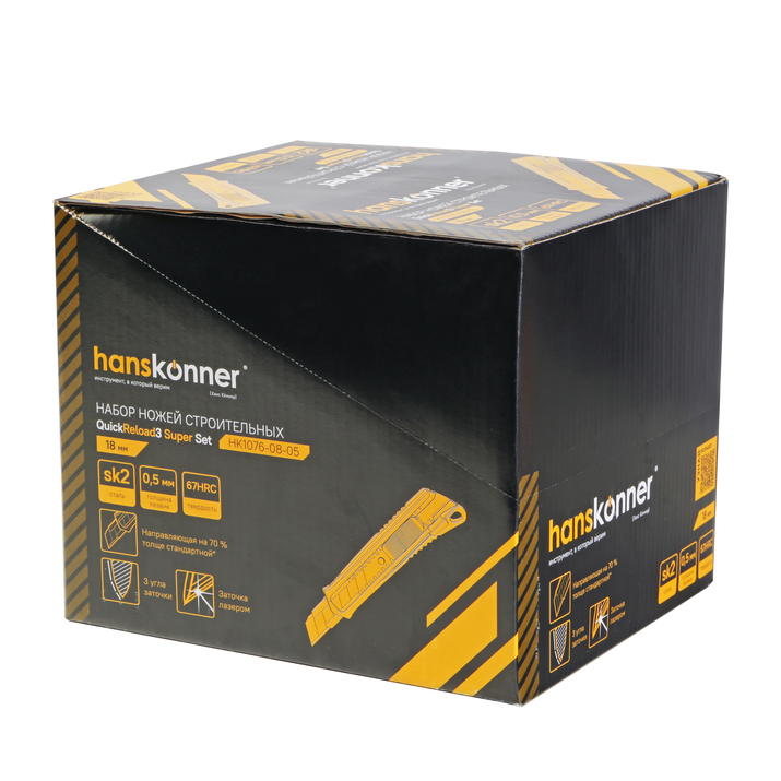 Строительный нож Hanskonner QuickReload3 (быстрая замена лезвия) подходит для работ с повышенными нагрузками, требующими особой точности и быстрой замены отрабо танного лезвия.. Благодаря сверхпрочной металлической направляющей достигается улучшенная устойчивость конструкции п ри давлении на инструмент. Лёгкий и прочный корпус из высококлассных материалов удобно лежит в руке, а текстурированная поверхность с упором под большой палец обеспечивает полный контроль инструмента. Лезвие из высо кокачественной стали SK2 c трёхгранной заточкой и дополнительной обработкой лазером служит в 5 раз дольше стандартного. Уникальный запатентованный механизм быстрой блокировки/разблокировки направляющей позволит легко заменить лезвие и максимально оперативно вернуться к работе.Возможно, вас заинтересует