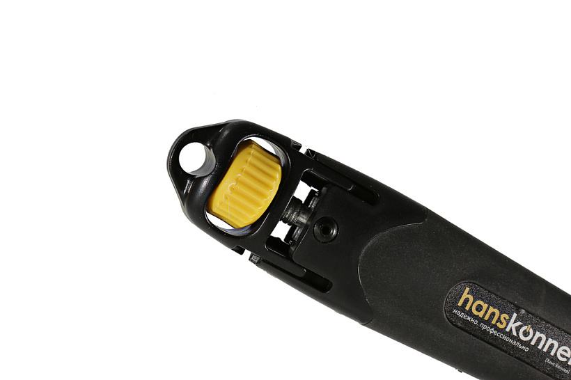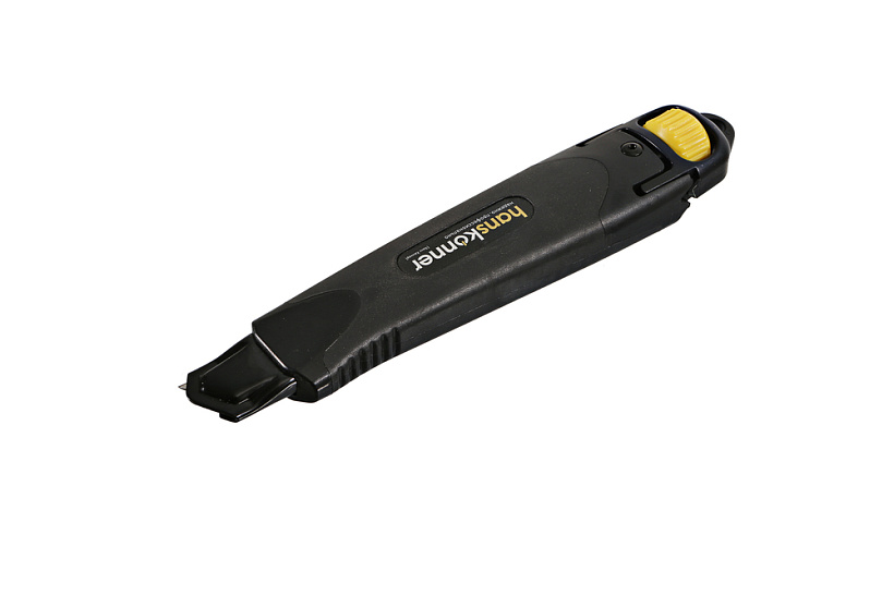 Строительный нож Hanskonner SolidFixation (усиленная фиксация лезвия) подходит для работ с высокими нагрузками, требующих повышенной точности и интенсивности. Благодаря корпусу из чистого высококачественного пластика и сверхпрочной металлической направляющей достигается улучшенная устойчивость конструкции при давлении на инструмент. Обрезиненная поверхность с упором под большой палец обеспечивает полный контроль ножа. Лезвие из высококачественной стали SK2 с трёхгранной заточкой и дополнительной обработкой лазером служит в 5 раз дольше стандартного. Уникальный запатентованный фиксирующий винт плотно прижимает режущий элемент к направляющей, что позволяет полностью передать усилие на рабочую кромку.