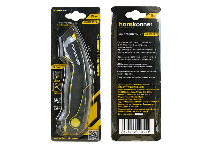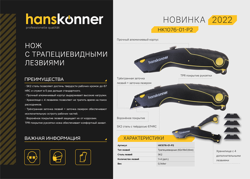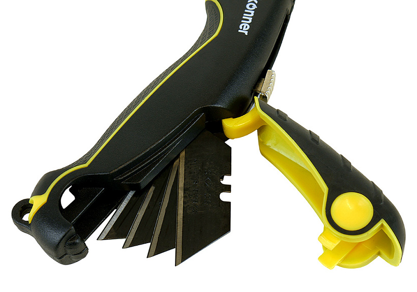 Нож строительный, трапециевидное лезвие, 4 доп. лезвия, SK2 сталь, Hanskonner