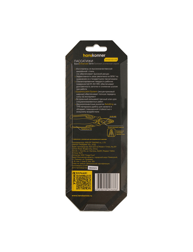 Пассатижи 175мм, эксц. шарнир,+30% к силе реза, СrV, TPR рук., Hanskonner