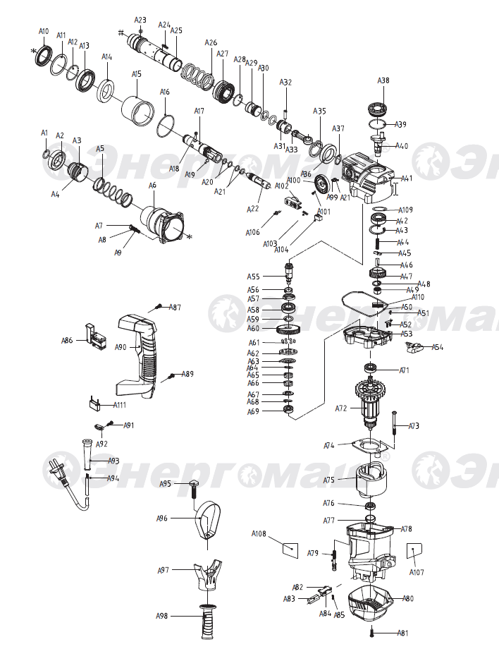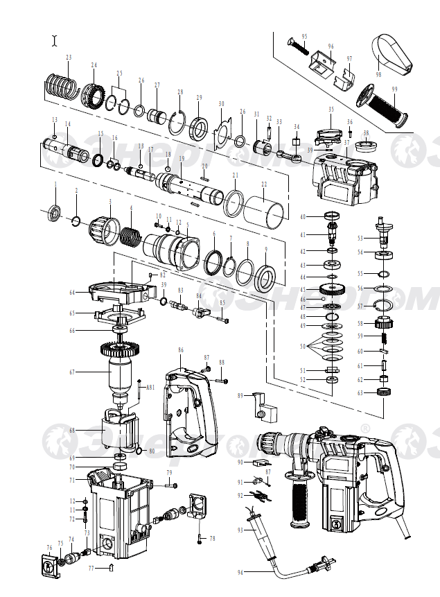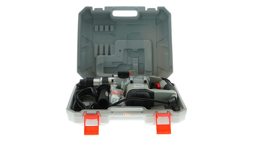 Долото, смазка для хвостовиков буров, пылезащитный колпачок, ключ вилочный, ограничитель глубины сверления, буры SDS+ 5,6,8мм, дополнительная рукоятка в комплекте.