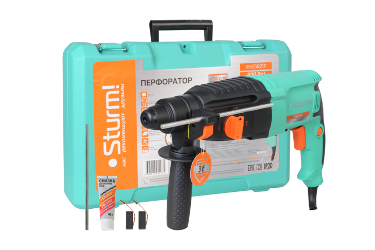 Sturm RH2524BR – универсальный трехрежимный перфоратор c патроном под оснастку SDS Plus. Имеет классическую горизонтальную компоновку с продолговатым узким корпусом и небольшую массу, за счет чего максимально удобен при высотных работах, а также при эксплуатации в условиях с ограниченным доступом. Корпус инструмента выполнен из высококачественного пластика с применением нейлона и демонстрирует хорошую стойкость к ударам и воздействию низких температур Модель оснащена электродвигателем мощностью 800 Вт и усиленным вакуумно-компрессионным механизмом, развивающим энергию удара – 3.0 Дж – это дает возможность уверенно бурить отверстия диаметром до 24 мм в материалах различной твердости, включая кирпичную кладку, камень и бетон. Наличие функции реверса с подпружиненным механизмом поворота щеточного узла позволяет сохранять одинаковую мощность при любом направлении вращения и исключить случайные переключения во время использования Перфоратор Sturm RH2524BR является трехрежимным – в зависимости от конкретной задачи пользователь выбирает нужный: сверление, сверление с ударом, либо режим удара. Также, предусмотрен отдельный режим, дающий возможность установки долота в любом угловом положении. Для безопасности пользователя в перфораторе установлена предохранительная кулачковая муфта SafetyClutch, гарантирующая защиту от обратного удара в случае заклинивания оснастки. Сетевой кабель 4VelcroRubber имеет резиновую изоляцию, что сохраняет его гибкость и эластичность в условиях низких температур, а четырехметровая длина кабеля дает возможность использовать инструмент без применения дополнительного сетевого удлинителя, обеспечивая рабочую зону площадью до 50 м2. Инструмент штатно комплектуется вместительным пластиковым кейсом для удобства хранения и транспортировки.