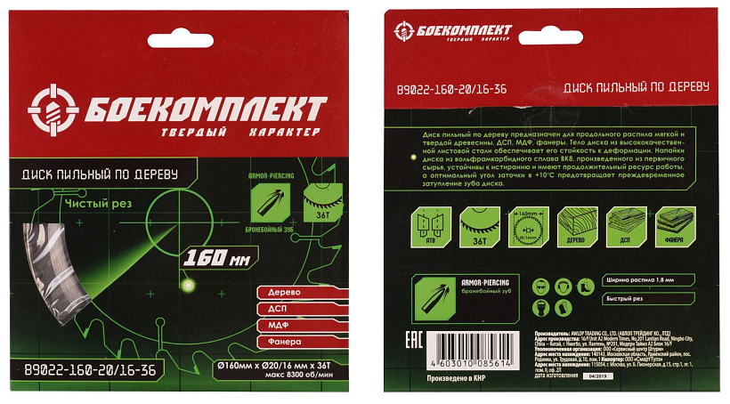 Пильный диск по дереву 160x20/16мм, 36 зубьев, БОЕКОМПЛЕКТ