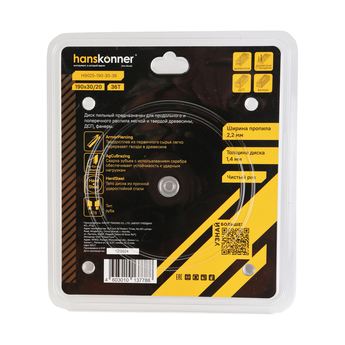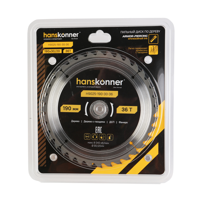 Пильный диск по дереву ArmorPiercing 190x30/20мм, 36 зубьев, Hanskonner