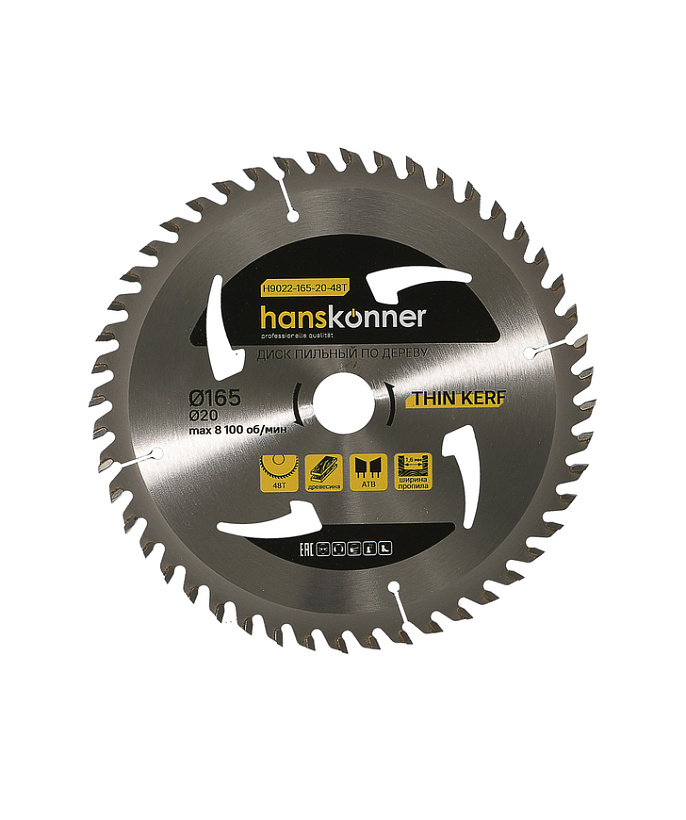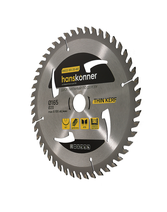 Пильный диск по дереву THIN KERF 165x20 мм, 48 зубьев, Hanskonner