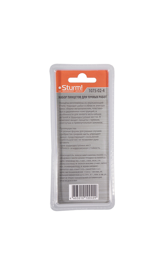 Набор пинцетов Sturm! 1075-02-4 Комплект состоит из 4 видов пинцетов: прямого пинцета, пинцета с захватом под углом 45, пинцета с изогнутым широким захватом и пинцетом обратного действия.